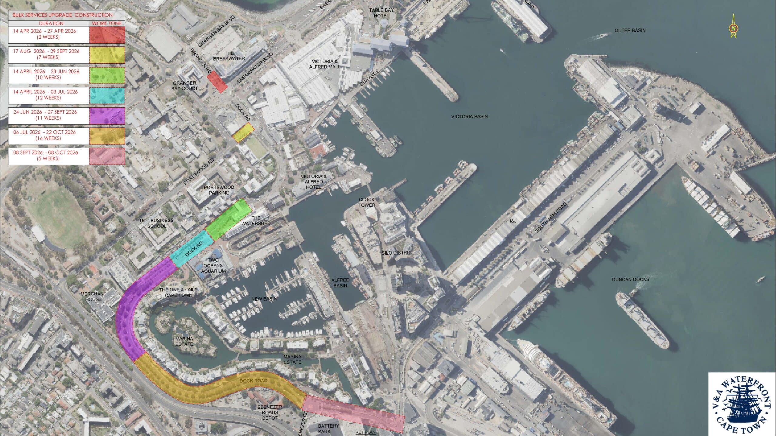14 Apr 2026 The V&A Waterfront will resume its major infrastructure programme to replace ageing water and sewer pipelines, an essential investment to support long-term growth, service reliability and sustainability across the precinct. The work will take place over approximately 33 weeks, from mid-April to the end of November 2026, and will be carried out in carefully managed phases to minimise disruption. The scope of work includes excavation, trenching and road reinstatement. Most of the construction activity will be focused along sections of Dock Road, adjacent to The Watershed and the Two Oceans Aquarium, extending up to Ebenezer Circle and then down to the Astron garage intersection. Traffic and pedestrian access To maintain access throughout the construction period: On Dock Road, two outgoing traffic lanes and one incoming lane will remain open. Traffic marshals and clearly marked signage will be positioned at affected points to assist traffic flow and ensure pedestrian safety. Parking and access alternatives Visitors are encouraged to make use of alternative parking and access options, including: Silo and Clock Tower parking garages, which will be free on weekends from the start of May to the end of October. Battery Park parking garage, which will remain free to the public on weekends. Access the Waterfront via Helen Suzman Boulevard at Portswood Road as well as Granger Bay Boulevard for parking closer to the Victoria Wharf Shopping Centre. To further support pedestrian movement, an electric shuttle service using electric golf carts and three wheeled e-bikes operates across the precinct, free on weekdays only. Waterfront remains open The V&A Waterfront remains open and fully operational, with retailers, restaurants and all our other attractions continuing to welcome visitors as usual. The precinct thanks tenants, residents and visitors for their patience and cooperation while this essential infrastructure upgrade is underway.